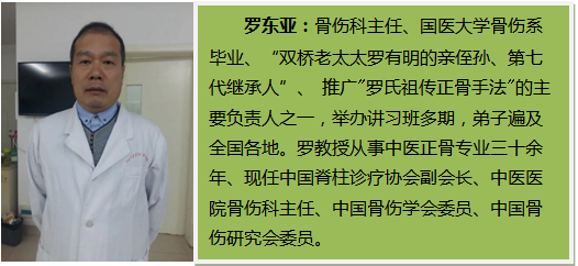 羅東亞:骨傷科主任、國(guó)醫(yī)大學(xué)骨傷系畢業(yè)、“雙橋老太太羅有明的親侄孫、第七代繼承人”、 推廣"羅氏祖?zhèn)髡鞘址?的主要負(fù)責(zé)人之一,舉辦講習(xí)班多期,弟子遍及全國(guó)各地。羅教授從事中醫(yī)正骨專業(yè)三十余年、現(xiàn)任中國(guó)脊柱診療協(xié)會(huì)副會(huì)長(zhǎng)、中醫(yī)醫(yī)院骨傷科主任、中國(guó)骨傷學(xué)會(huì)委員、中國(guó)骨傷研究會(huì)委員。