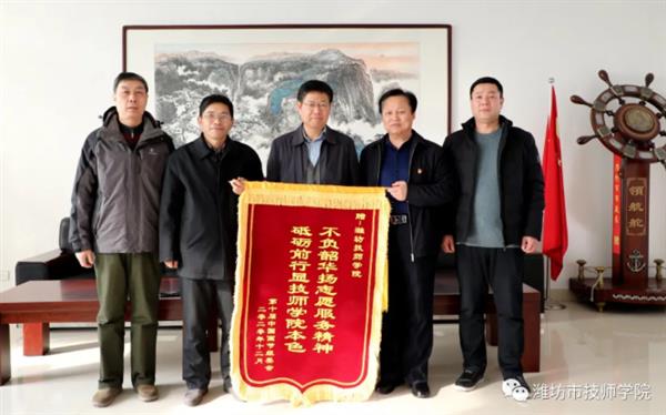 1月5日上午,第十屆中國(guó)畫節(jié)組委會(huì)領(lǐng)導(dǎo)李培華、趙克增代表組委會(huì)到濰坊技師學(xué)院贈(zèng)送繡有“不負(fù)韶華揚(yáng)志愿服務(wù)精神 砥礪前行顯技師學(xué)院本色”的錦旗,院長(zhǎng)丁漢邦、副院長(zhǎng)劉華堂接待來賓并代表濰坊技師學(xué)院接受錦旗。