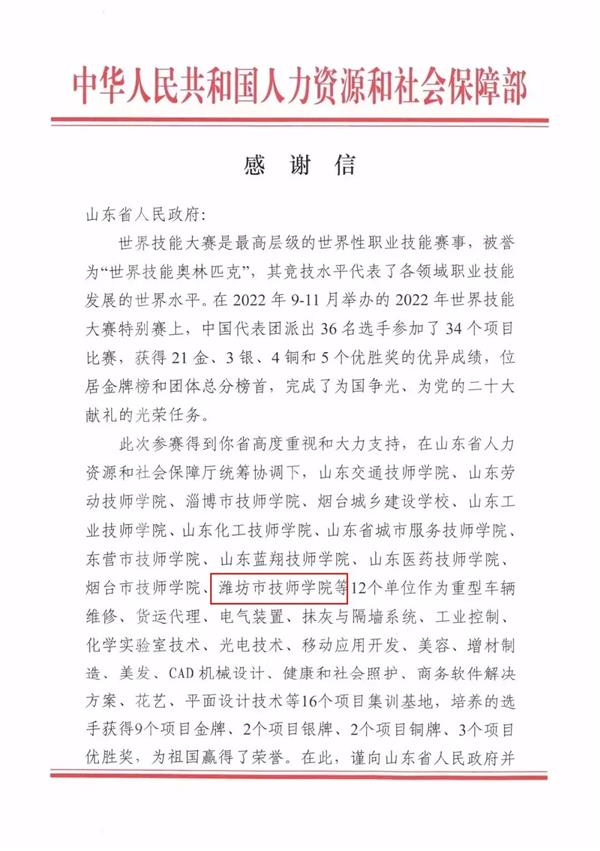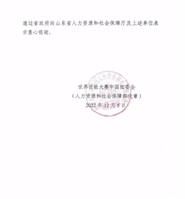 近日,世界技能大賽中國組委會(人力資源和社會保障部)向山東省人民政府發(fā)來感謝信,感謝我院等12所技師學院作為花藝等國家集訓基地,培養(yǎng)的選手在9月至11月舉辦的 2022 年世界技能大賽特別賽上獲得9個項目金牌、2個項目銀牌 、2個項目銅牌、3個項目優(yōu)勝獎,為祖國贏得了榮譽。