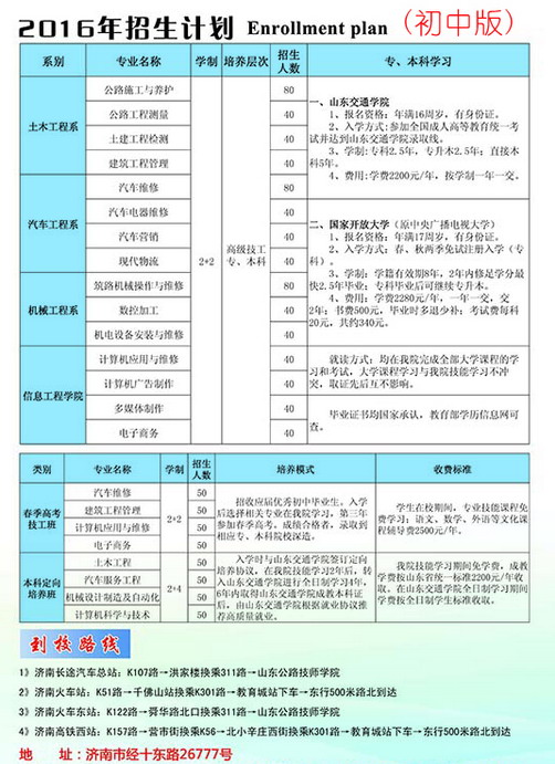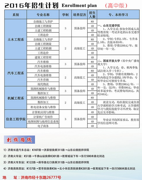 山東公路技師學(xué)院簡(jiǎn)介 山東公路技師學(xué)院直屬于山東省交通運(yùn)輸廳,是一所以培養(yǎng)交通行業(yè)高技能人才為主,集職工培訓(xùn)、成人教育、技能鑒定、駕駛培訓(xùn)和智慧交通技術(shù)應(yīng)用與試驗(yàn)于一體的綜合性公辦全日制技師學(xué)院。 學(xué)院目前兩地三區(qū)辦學(xué),主校區(qū)、無(wú)影山校區(qū)和德州校區(qū),其中主校區(qū)坐落在濟(jì)南市經(jīng)十東路,交通便利,設(shè)施設(shè)備先進(jìn)齊全,環(huán)境優(yōu)美??傉嫉孛娣e700余畝,建筑面積16萬(wàn)平方米,現(xiàn)有教職工300余人,在校生達(dá)12000余人。學(xué)院設(shè)有公路工程系、運(yùn)輸工程系、汽車(chē)工程系、智能控制系、信息與管理工程系、基礎(chǔ)部、智慧交通技術(shù)應(yīng)用與試驗(yàn)中心五系一部一中心,常設(shè)專(zhuān)業(yè)37個(gè)。 學(xué)院19..