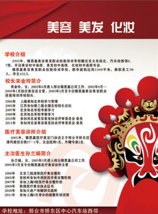 媚思嘉美容美發(fā)化妝培訓(xùn)學(xué)校簡介 媚思嘉美容美發(fā)化妝培訓(xùn)學(xué)校是經(jīng)勞動部門批準(zhǔn)成立的一所正規(guī)的技能培訓(xùn)學(xué)校,并被市總工會、共青團市委、勞動和社會保障局聯(lián)合指定為下崗職工、待業(yè)青年再就業(yè)及陽光工程培訓(xùn)基地。為培訓(xùn)更多的美容、美發(fā)、化妝技能者,為解決更多的待業(yè)青年、下崗職工的就業(yè)問題,我們長期開設(shè)學(xué)習(xí)班,條件優(yōu)越,師資力量雄厚,特聘高級講師10名,秉承新教學(xué)理念,開拓美容美發(fā)教學(xué)新典范。 媚思嘉美容美發(fā)化妝培訓(xùn)學(xué)校環(huán)境優(yōu)雅交通方便,備有食宿,擁有高標(biāo)準(zhǔn)教學(xué)樓和先進的電教設(shè)備,媚思嘉美容美發(fā)化妝培訓(xùn)學(xué)校還在市周邊地區(qū)開設(shè)免費的實習(xí)基地,為學(xué)生創(chuàng)造好..