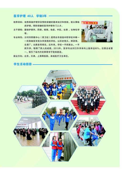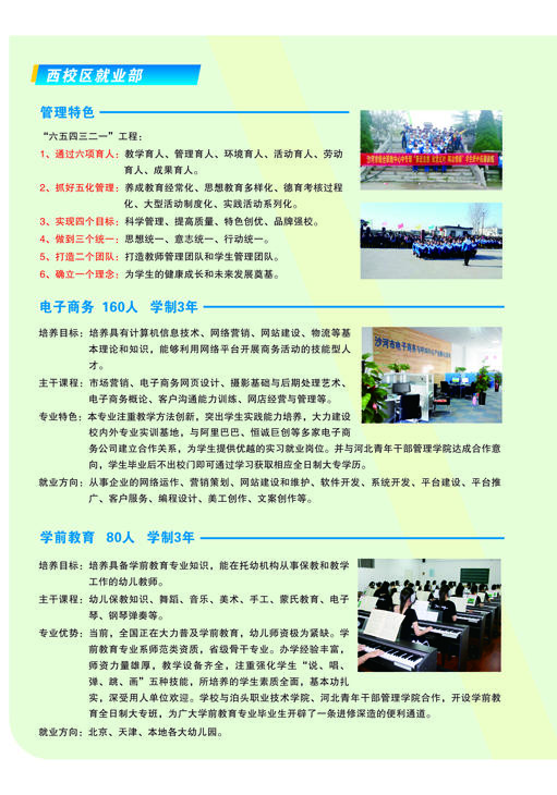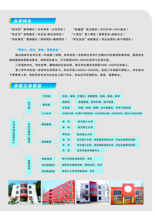 河北省沙河市綜合職教中心介紹 河北沙河市綜合職教中心始建于1995年,2011年7月沙河市人民政府將原二十冶技校(含邢臺機(jī)械電子工程學(xué)校)、原沙河市衛(wèi)生學(xué)校合并到沙河市綜合職教中心。 整合后的職教中心以“先搭建框架,再豐滿血肉”為辦學(xué)思路,通過開展多資質(zhì)、多層次、多形式、多類別辦學(xué),逐步構(gòu)建起全日制學(xué)歷教育、成人教育和職業(yè)培訓(xùn)并舉的立體職教框架,形成了學(xué)歷教育與職業(yè)培訓(xùn)規(guī)模大體相當(dāng),全日制中職教育與成人教育規(guī)模大體相當(dāng)、升學(xué)教育與就業(yè)教育規(guī)模大體相當(dāng)?shù)霓k學(xué)格局。 河北省沙河市綜合職教中心占地99101平方米(148.6畝),分為東、西兩個(gè)校區(qū),總建筑面積為..
