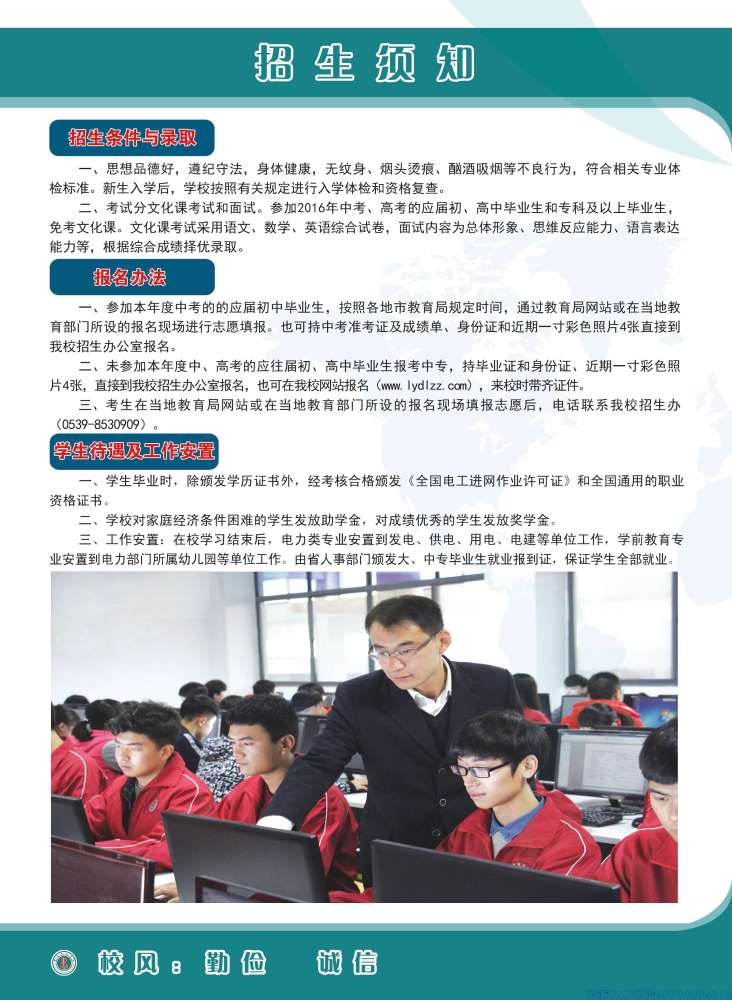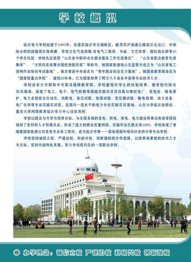 國家級重點學(xué)校 山東省高水平學(xué)校 一、臨沂電力學(xué)校概況 臨沂電力學(xué)校始建于1993年,系國家級重點學(xué)校、山東省示范性中職學(xué)校、山東省首批高水平中等職業(yè)學(xué)校、山東省首批五年制高等職業(yè)教育試點專業(yè)學(xué)校。在校生5100余人,學(xué)校規(guī)模和綜合實力在全國電力類中職學(xué)校中位居前列,是全國電力職業(yè)教育指導(dǎo)委員會委員單位。 學(xué)校專業(yè)特色鮮明。設(shè)有五年制高職(大專)和中專兩個辦學(xué)層次,設(shè)立就業(yè)班和高考班。開設(shè)熱能動力工程技術(shù)、電力系統(tǒng)自動化技術(shù)、電氣自動化技術(shù)、新能源裝備技術(shù)、分布式發(fā)電與智能微電網(wǎng)技術(shù)、電廠集控運行、火電廠熱力設(shè)備運行與檢修、發(fā)電廠及變電站運行與維護(hù)..