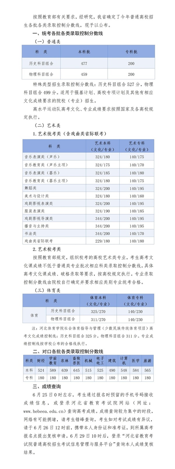 2025年河北省普通高校招生各批各類錄取控制分數(shù)線
